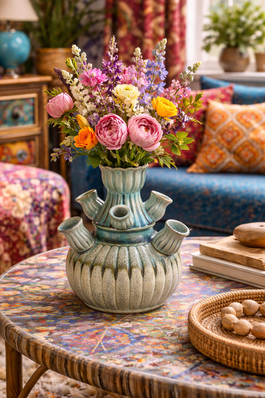 Deze tulpenvaas is gemaakt om boeketten tot leven te brengen. De speelse vorm nodigt uit om tulpen of andere bloemen mooi te schikken, terwijl de blauwe kleur zorgt voor een frisse en stijlvolle uitstraling. Perfect voor op tafel, een dressoir of in de vensterbank – deze vaas geeft elk interieur net dat beetje extra karakter.
